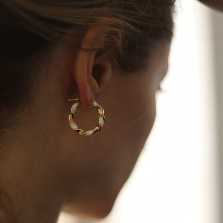 Hoop earrings are a classic that is always in trend. The original twisted design was complemented with white enamel. Such an accessory will be a great gift for a loved one or for yourself.