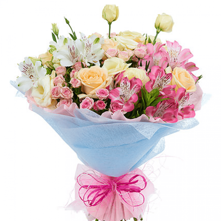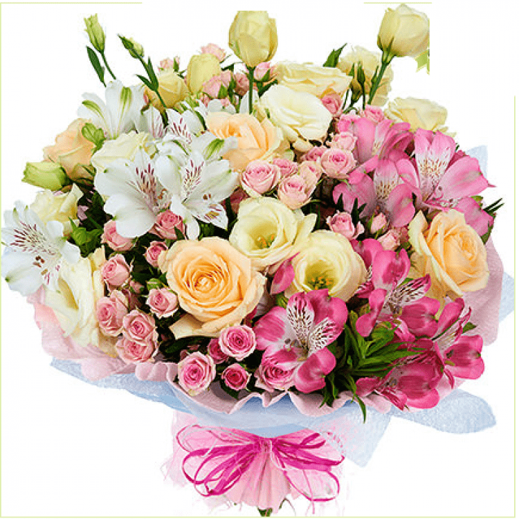 Склад: 5 кремових троянд, 3 гілки ніжної еустоми, 5 гілок кущової троянди, альстромерії, зелень, оформлення може відрізнятися.