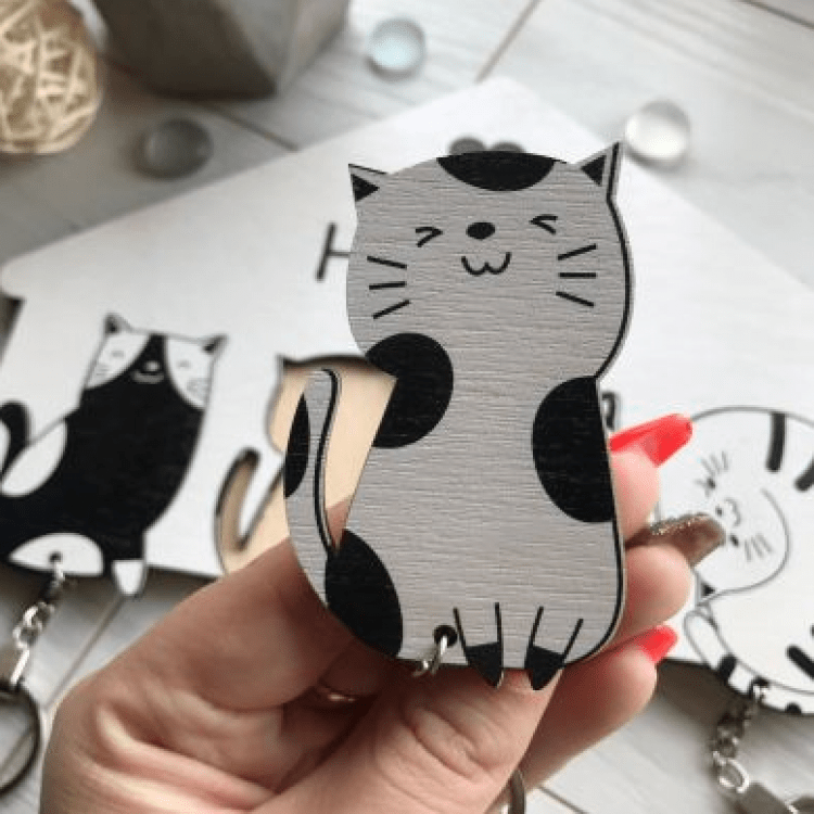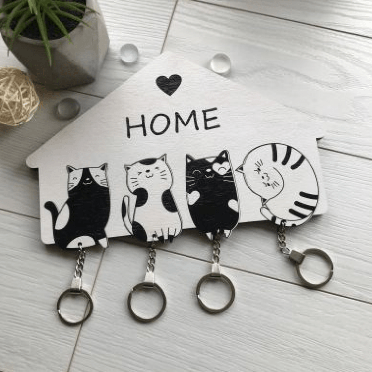 Чорно-біла дерев'яна ключниця з котиками