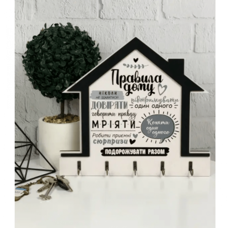 Дерев'яна настінна ключниця з правилами дому