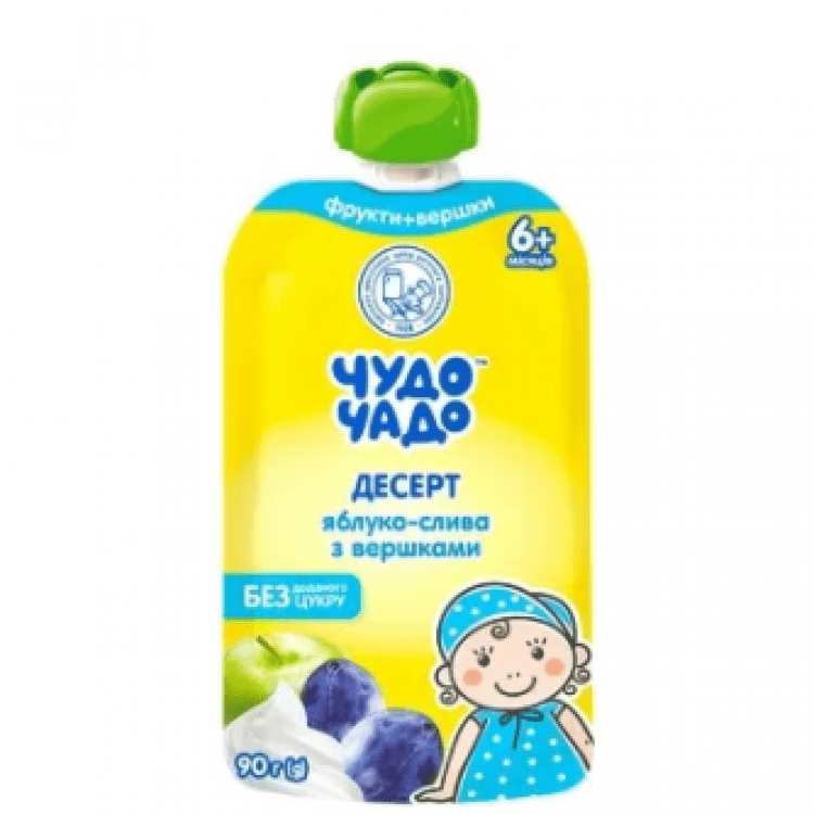 Опис: Десерт фруктовий Чудо-Чадо яблуко-слива з вершками 90г
