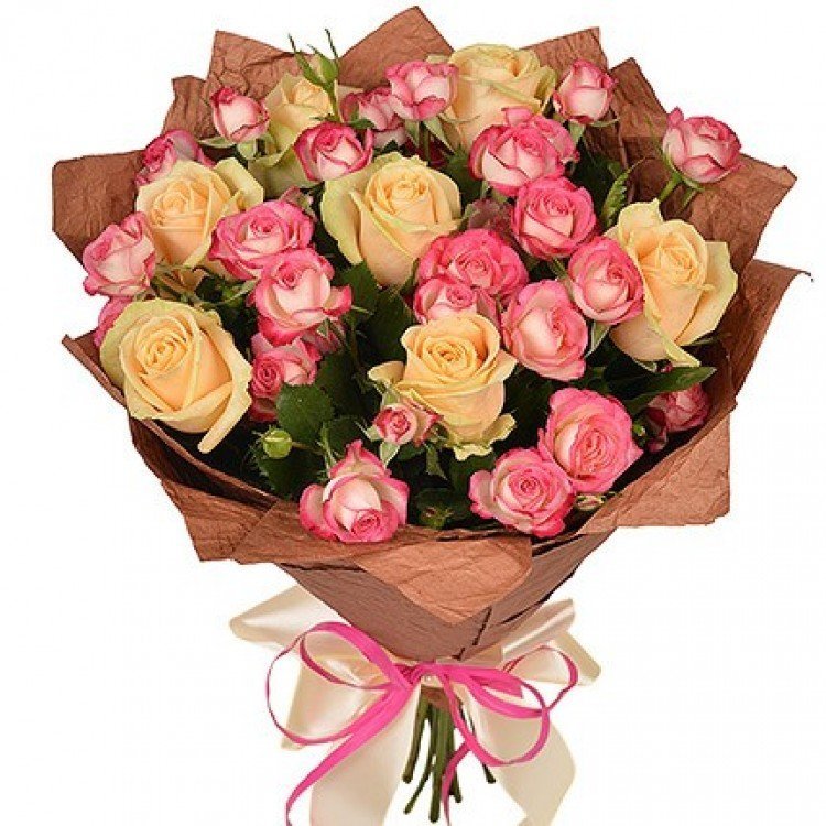 Шикарне поєднання ніжних кремових троянд, кущових рожевих троянд і оригінальної упаковки подарує одержувачу позитивні емоції і надовго закарбується в пам'яті! Робіть незабутні подарунки коханим!