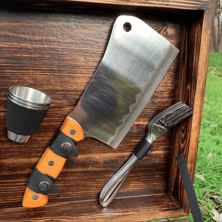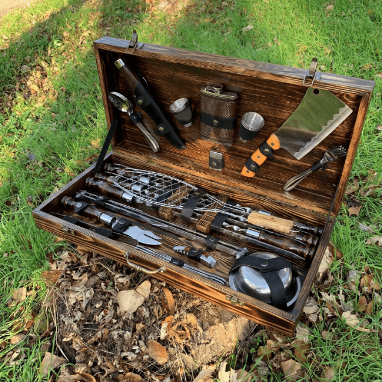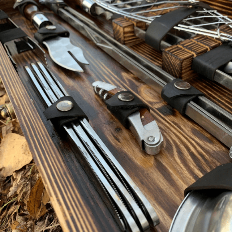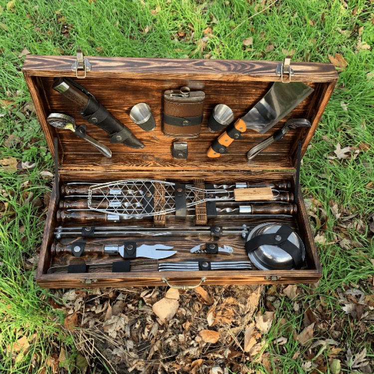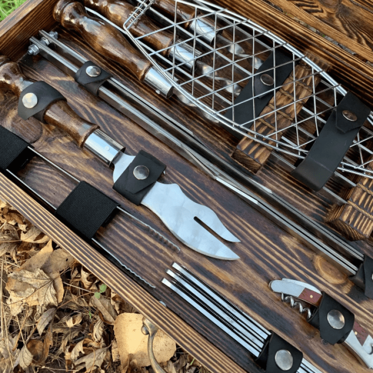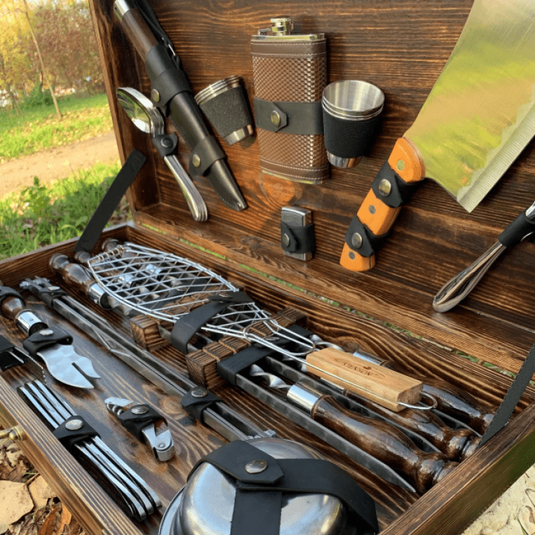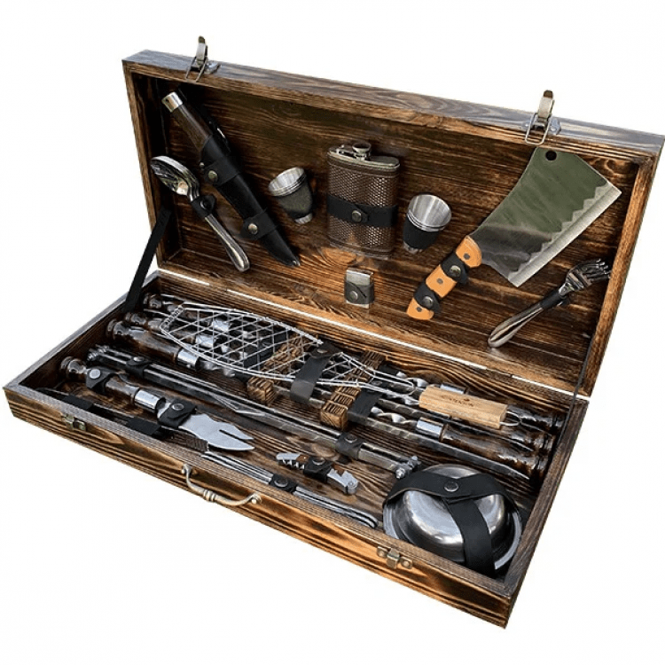 Комплектація: Шампури 6 шт. (нержавіюча сталь, товщина леза 3мм, ширина-12мм), Ложки 6 шт., Ніж Мисливський в шкіряних піхвах, Стопки 6 шт., Фляга 1 шт., Запальничка Zippo (бензин) 1 шт., Сокиру-сапка 1 шт., Вилки 6 шт., Решітка гриль 1 шт., Таганок 1 шт., Вилка-ніж для зняття м'яса 1 шт., Штопор-відкривачка 1 шт., Щипці для м'яса/вугілля, Ножі столові 6 шт., Тарілка глибока 6 шт., Коробка крафт з натурального дерева.