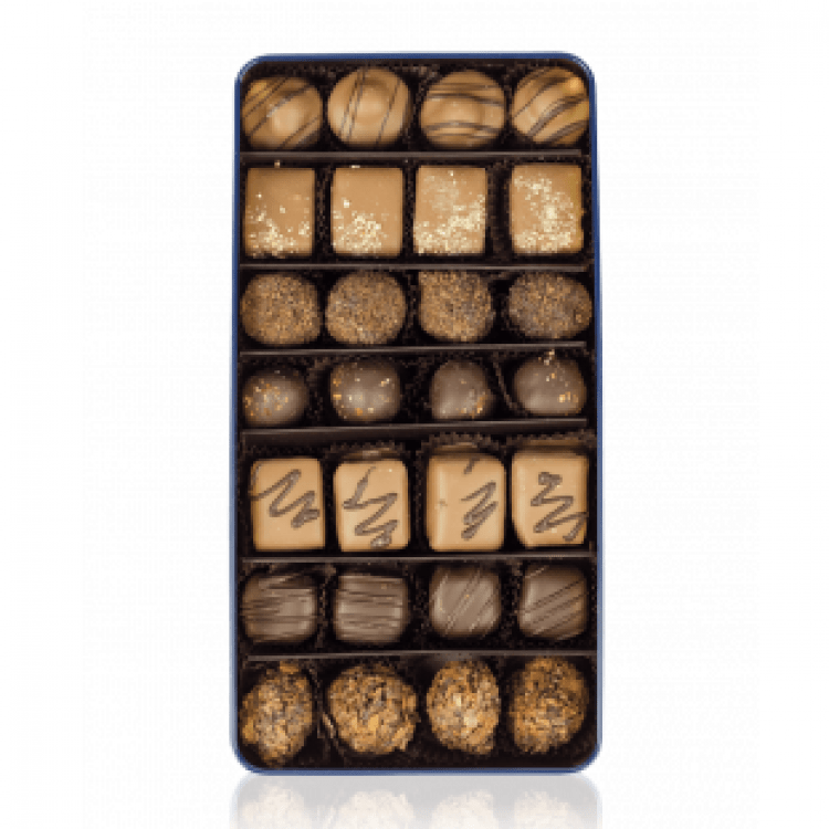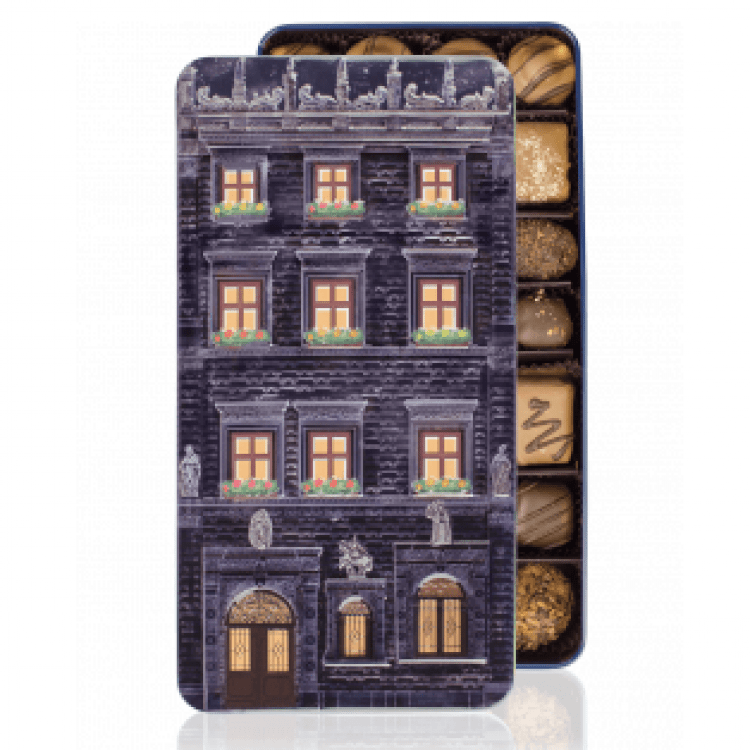 Набір з 28 трюфельно-марципанових цукерок: Востра фацка – трюфель на основі чорного шоколаду з вершковим маслом та перцем чилі у чорному шоколаді; Амарант – марципаново-шоколадний крем у молочному шоколаді; Карамельна захцянка – ганаш на основі білого шоколаду з додаванням вершкового масла та карамельної пасти, вкритий чорним шоколадом та хрусткими пластівцями; Квартка – шоколадно-карамельний ганаш, вкритий молочним шоколадом та подрібненим мигдалем; Конфітура – марципан з подрібненим волоським горіхом та аґрусом, вкритий молочним шоколадом; Майхер – ганаш на основі чорного шоколаду з вершковим маслом, вкритий чорним шоколадом; Емерит – марципаново-шоколадний крем з ароматом капучино, вкритий чорним шоколадом та шоколадним цукром.