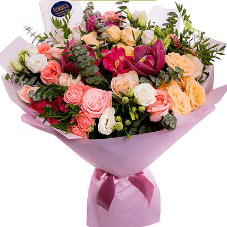 Склад: 3 квітки орхідеї, 13 рожевих і кремових троянд, 4 гілок ніжної еустоми, 5 гілок кущової троянди, 2 альстромерії, евкаліпт, зелень, оформлення.