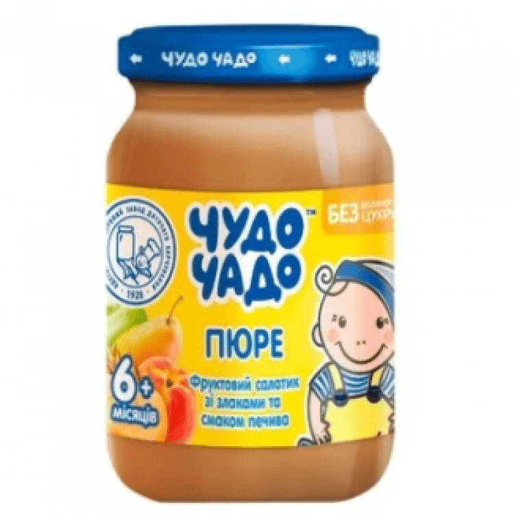 Опис: Пюре Чудо-Чадо Фруктовий салатик зі злаками та смаком печива з 6 місяців без цукру 170г