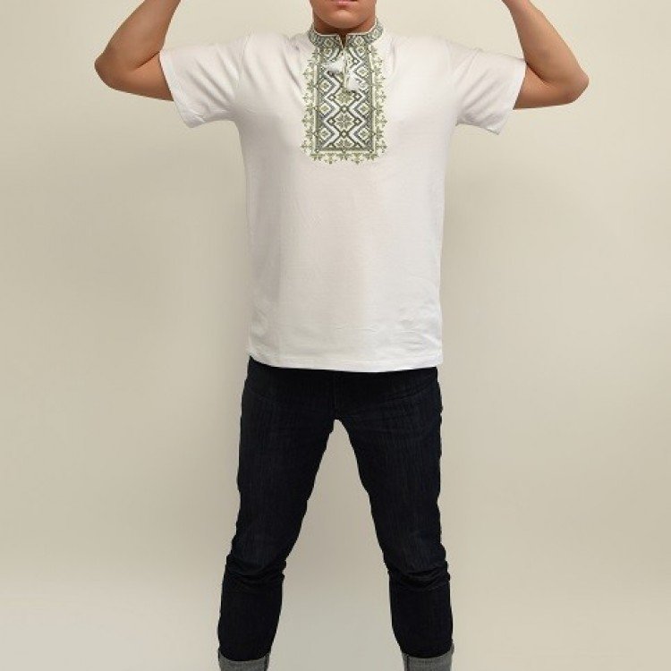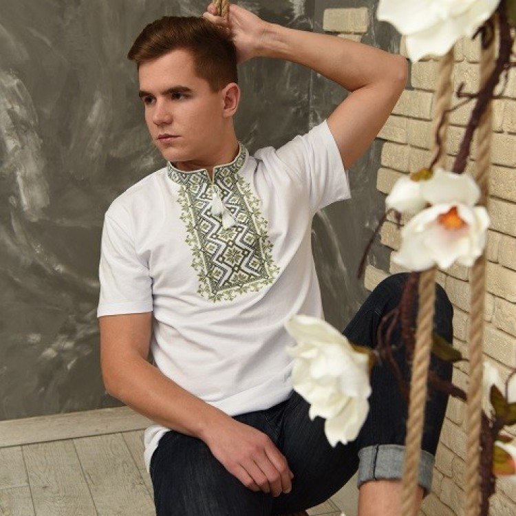 Опис: Вишиванка чоловіча "ЗОРЕПАД" (БІЛА З ОЛИВКОВОЮ )