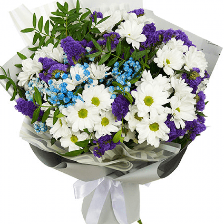 Склад: 5 гілок білої ромашкової хризантеми, статиця, гіпсофіла, зелень, оформлення.